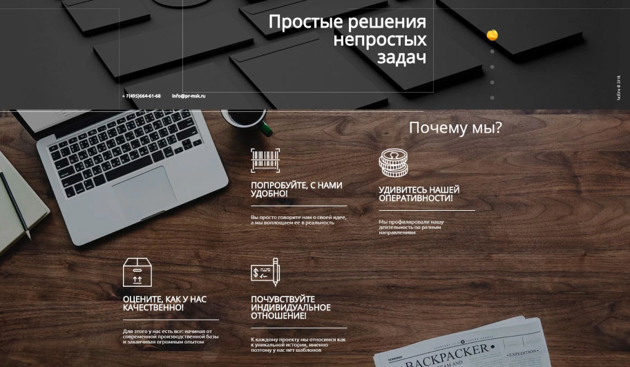Основная функция такого сайта – это презентация Ваших услуг в Интернете. Сайты-визитки стоят недорого, т.к. нет сложного функционала и интеграций со сторонними системами, так что это отличный вариант для небольших компаний, частных предпринимателей и самозанятых.